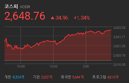 KOSPI : 2,648.76 (+1.34%)