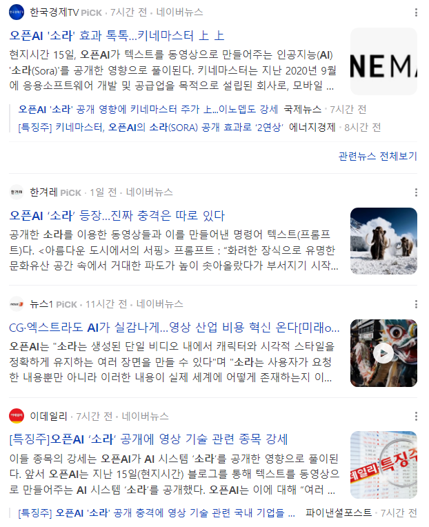 | 키네마스터 | 오픈AI소라 공개 이후 수혜 지속 기대감에 강세, +29.93% 상승한 7,250원으로 마감 |
