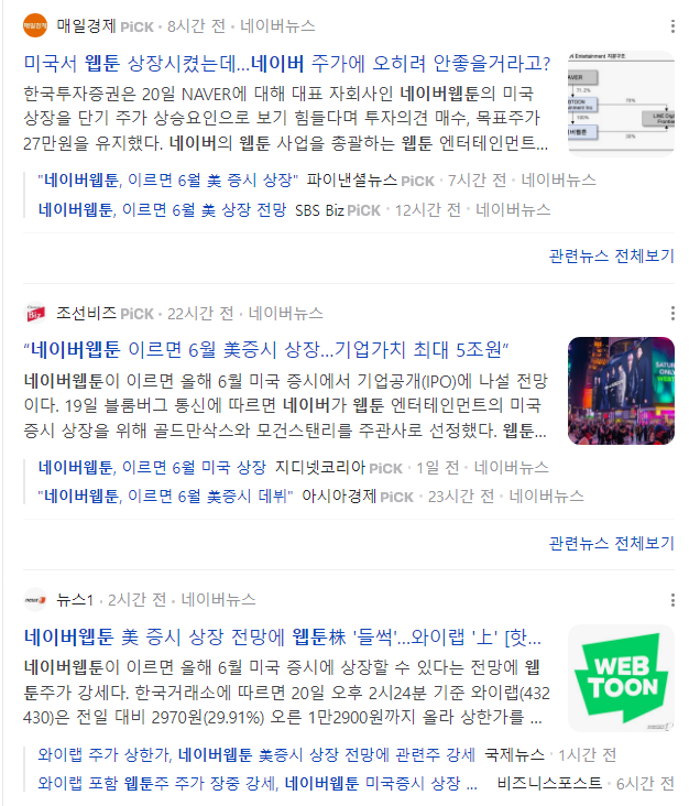 ☞ 네이버웹툰 예상 기업 가치는 30억 달러(약 3조 9천990억 원)에서 40억 달러(약 5조 3천320억 원) 수준으로, IPO를 통해 5억 달러를 조달할 예정입니다. 주관사로는 골드만삭스와 모건스탠리가 선정되었습니다. 웹툰 인기는 국내외적으로 매출 성장 확대 기조를 보이고 있습니다. 카카오의 일본 법인. 카카오픽코마가 운영하는 현재 웹툰 플랫폼 '픽코마'는 지난해 거래액이 1000억 엔을 넘기면서 2016년도 이후 최고 기록을 세운 바 있습니다. 네이버 웹툰 산하 라인망가와 이북재팬의 거래액도 지난해 1000억 엔을 달성하였습니다. 재혼황후, 약탈신부 같은 일부 웹툰은 일본 내 월 거래액이 1억 엔을 육박할 정도로 인기 있는 웹툰도 등장했습니다....