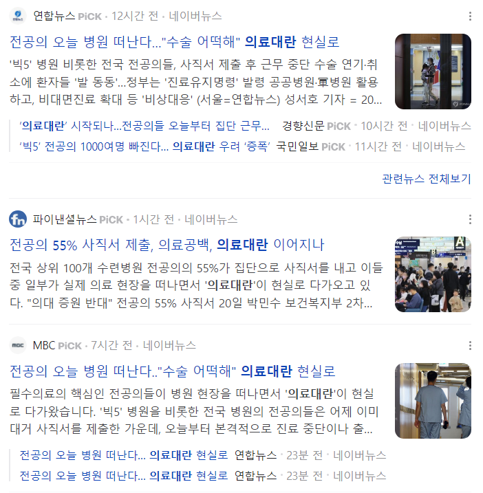 ☞ 20일 필수의료의 핵심인 전공의들이 병원 현장을 떠나면서 '의료대란'이 현실로 다가왔습니다. '빅5' 병원을 비롯한 전국 수 련병원에서 전공의들이 이미 대거 사직서를 제출했고, 이날부터는 본격적으로 병원 이탈 행렬이 이어질 것으로 보이는 상황입니다. 정부는 전공의 사직서 제출을 집단행 동으로 간주하고 엄단하겠다는 입장인 가운데, 의료진 공백에 따른 수술 연기 등의 피해는 고스란히 환자들의 몫이 되었습니다... 20일 정부와 의료계에 따르면 서울대·세브란스·삼성서울·서울아산·서울성모병원 등 '빅 5' 병원의 전공의들은 이날 오전 6시를 기해 근무를 중단하였습니다. 전날 이미 1천 명이 넘는 '빅 5' 소속 전공의들이 사직 의사를 밝힌 것으로 전해졌습니다. 이들 5개 병원에는 전공의 2천745명이 소속되어 있습니다.