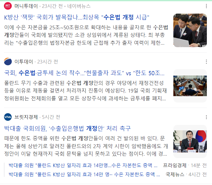 ☞ 한국은 지난 2년간 폴란드와 약 17조 원 규모의 방산계약을 체결하였습니다. 30조 원 규모의 2차 수출 논의도 진행 중인 상황입니다. 하지만 수출입은행의 법정자본금 부족으로 계약이 파기될 수 있단 우려가 제기되었습니다. 그 이유는 해외 대형 수주를 뒷받침할 정책금융을 공급하기 위한 수은 법정자본금(15조 원)의 98%가 소진돼 추가 자금 공급 여력이 없어진 상태이기 때문입니다. 이에 수은 자본금을 25조 ~ 50조 원으로 확대하는 내용을 골자로 한 수은법 개정안들이 국회에 발의됐지만 소관 상임위에서 계류된 상태입니다.