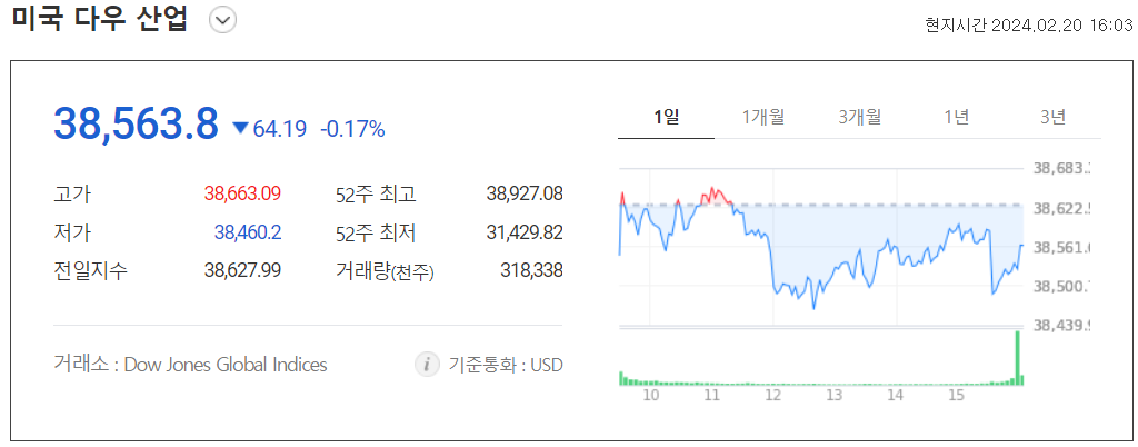 ● 다우 -0.17% (38,563.80P) / 나스닥 -0.92% (15,630.78P) / S&P500 -0.60% (4,975.51P )