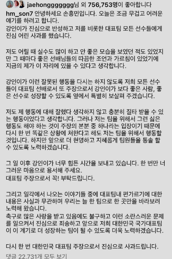 또한, "강인이가 진심으로 반성하고 있다. 너그러운 마음으로 용서해달라" 라고 덧붙였습니다.