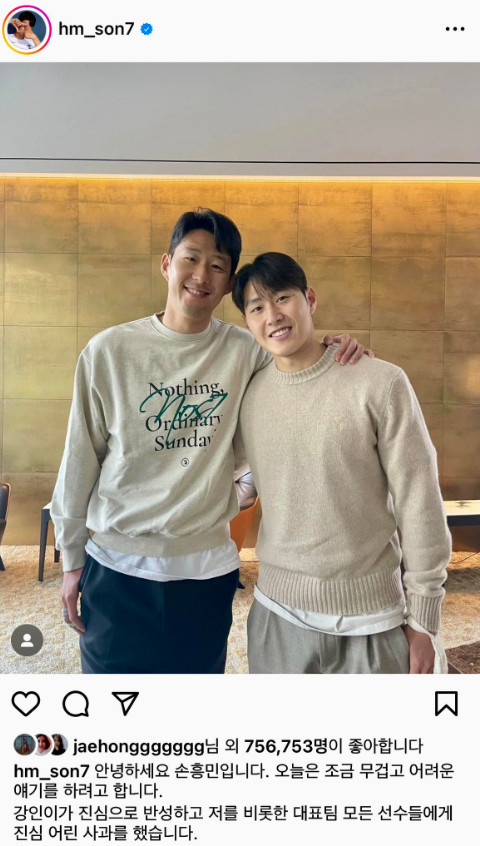 대한민국 축국 국가대표팀 주장 손흥민(32, 토트넘)선수가 런던으로 날아온 이강인(23, PSG)선수의 어깨를 다정하게 잡고 사진을 찍었습니다. 이강인 선수의 대면 사과에 큰 마음으로 화답을 했다고 합니다...