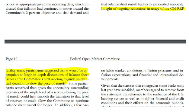 다행인 건 양적 긴축(QT)과 관련해선 진전된 언급이 나왔다는 것이죠.. 회의록은 "참석자들은 대차대조표 감축이 원활하게 진행되고 있으며, ON RRP(역레포) 사용량이 지속해서 감소하고 있는 상황에서 감축 속도를 늦추는 시점에 대해 심도 있는 논의를 시작하는 게 적절할 것이라고 언급했다"라고 덧붙였습니다.