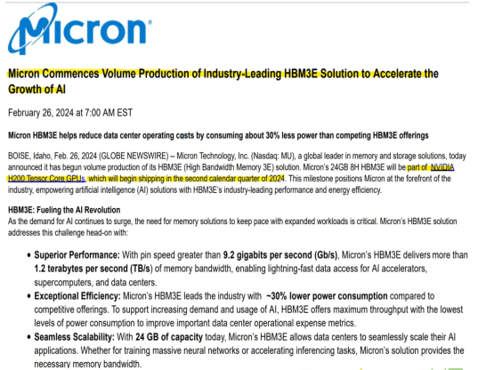 마이크론 테크놀로지는 전일(현지시간) 언론을 통해 "HBM3E 솔루션의 대량 생산을 시작했으며, 이번 24GB(기가바이트) 용량의 8H(8 단) HBM3E 는 올해 2 분기 출하를 시작하는 엔비디아 'H200'에 탑재될 예정" 밝힘. 이어, "HBM3E(고대역폭 메모리 3E)가 경쟁사 제품보다 30% 적은 전력을 소비하며, AI 애플리케이션을 구동하는 칩에 대한 수요 급증에 대응할 수 있을 것"이라고 밝혔습니다.