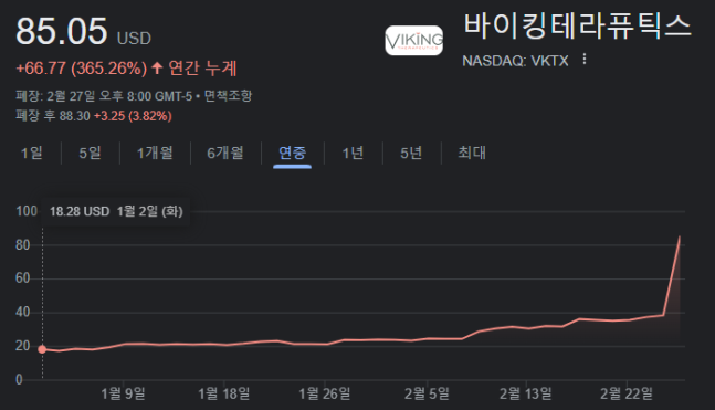 우선 바이킹테라퓨틱스는 비만·과체중 환자 170여 명을 대상으로 13주간 회사가 개발 중인 비만약 ‘VK2735’ 중간 단계 임상을 진행한 결과 이들의 체중이 평균 약 14.7% 감소하는 효과를 확인했다고 이날 밝혀 시장 눈길을 끌었다. 회사 주가는 올해 들어서만 365% 뛰어 네 배 이상 치솟은 상태다.