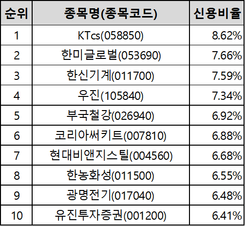 24년 03월 06일기준 코스피/코스닥 신용비율 상위(Top10) 종목에 대해 정리하였습니다.
