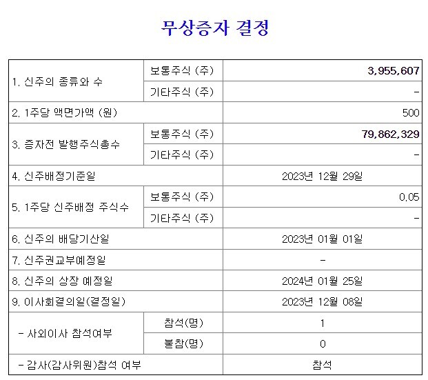 신주배정기준일은 2023년 12월29일이며, 주주명부에 등재된 주주에 대해 주식을 보유한 경우 100주당 5주의 주식을 무상으로 지급받게 되며, 무상증자 재원은 주식발행초과금을 활용했습니다. 신주는 2024년 1월25일 상장됩니다.