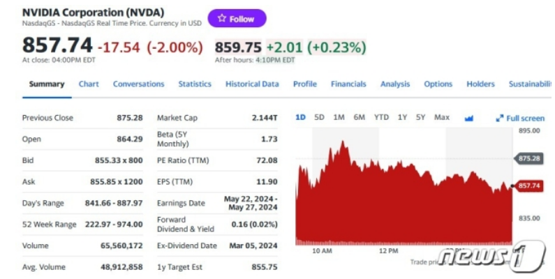 일단 엔비디아가 2% 하락했다. 이날 엔비디아는 전거래일보다 2.00% 하락한 857.74달러를 기록했다.