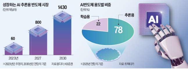 AI 개발 과정은 대규모 데이터를 습득해 모델을 구축하는 ‘학습’과 모델을 서비스에 적용하는 ‘추론’으로 나뉜다. 대다수 빅테크는 그래픽처리장치(GPU)에 고대역폭메모리(HBM)를 붙인 엔비디아의 AI 가속기를 학습, 추론 구분 없이 활용하고 있다. 대안이 없기 때문이다. 지난해 엔비디아 서버 매출의 40%(188억달러, 약 25조원)가 추론 분야에서 나왔다.