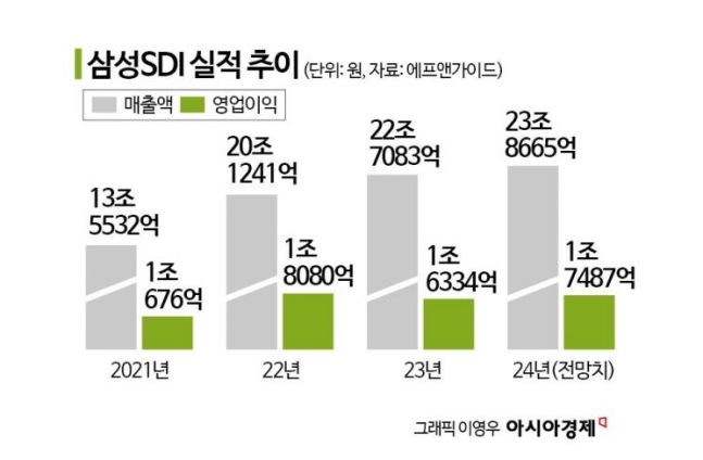 올해 상반기 실적도 부진할 것으로 전망되고 있다. 에프앤가이드에 따르면 증권사가 전망한 올해 1분기 삼성SDI의 매출액과 영업이익은 각각 5조2148억원과 2448억원이다. 이는 전년 동기 대비 각각 2.62%, 34.80% 감소한 수치다. 이용욱 한화투자증권 연구원은 "1분기 실적은 감익이 불가피할 것으로 전망한다"며 "배터리 가격은 올해 2분기까지 하락할 것으로 전망되는데 1분기에 가장 가팔라 수익성이 악화되는 구간이기 때문"이라고 말했다.