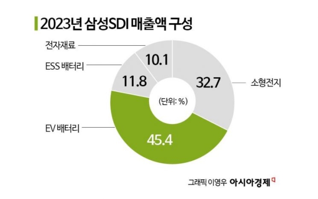 ◇지난해 글로벌 전기차 수요 둔화에 주가 곤두박질= 삼성SDI는 이차전지 전문기업이다. 소·중·대형전지 등 리튬이온 이차전지를 생산·판매하는 에너지솔루션 사업 부문과 반도체 및 디스플레이 소재 등을 생산·판매하는 전자재료 사업 부문을 영위하고 있다. 지난해 실적 기준 전체 매출액에서 에너지솔루션 부문이 차지하는 비중은 90%에 달한다.