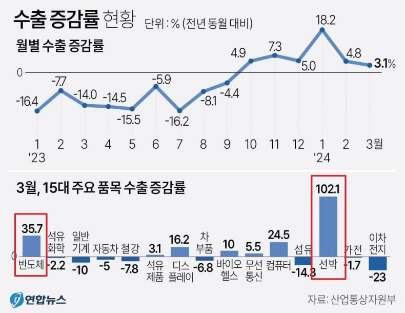 반도체 $117억, 전년 동월비 +35.7% ( 21개월래 최대 ) 디스플레이 +16.2%, 컴퓨터 +24.5%, 무선통신기기 +5.5% 선박 +102%, 바이오헬스 +10%, 석유제품 +3.1% 자동차 -5%, 일반기계 -10%