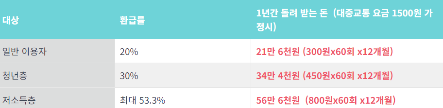 ② 예를들어, 1년기준으로 대중교통 요금이 1,500원 가정시, 월 최대 60회를 꼬박 이용시 일반 이용자의 경우 1년간 21만 6천원(300원 X 60회 X 12개월), 청년층은 1년간 34만 4천원(450원 X 60회 X 12개월), 저소득층은 1년간 56만 6천원(800원 X 60회 X 12개월) 환급 받을 수 있습니다.
