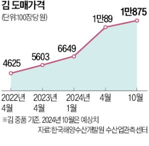 김밥용 김의 월간 평균 도매가격은 지난해 2월 5000원을 넘어선 뒤 9월 6000원대로 올라섰다. 올해 들어 가파른 상승세를 타더니 지난달 처음으로 1만원 선을 돌파했다. 수산업관측센터는 김 도매가격이 올해 12월까지 1만~1만1000원 선을 유지할 것으로 내다봤다. 마른김 원료인 물김의 산지 위판가격도 지난달 평균 ㎏당 2362원으로 1년 전(980원)보다 141% 폭등했다.