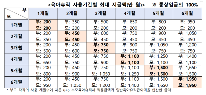 첫 6개월에 대해 부모 각각의 육아휴직 급여 상한을 높여서 지급하여