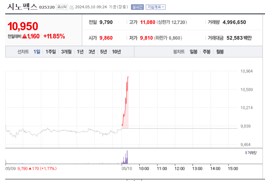 한편, 시노펙스 현재 주가는 10,950원을 기록하고 있다.