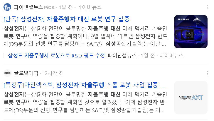 ☞ 애플이 10년간 공들여 온 자율주행 전기차 개발에서 손을 뗸 가운데 삼성전자도 자율주행차 알고리즘 선행 연구를 중단 삼성전자, 상용화 전망이 불투명한 자율주행 대신 미래 먹거리 기술인 로봇 연구에 역량을 집중할 계획 삼성전자 반도체(DS)부문의 선행연구를 담당하는 SAIT, 이날 연구 과제에서 자율주행을 제외하기로 최종 결정 SAIT는 자율주행 소프트웨어 연구에 투입했던 개발 인력을 '로봇 인텔리전스' 연구로 전환해 휴머노이드 로봇을 비롯한 미 래 로보틱스 연구 진행