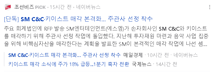 ☞ SM, 손자자회사인 SM C&C, 키이스트를 매각하기 위해 주관사 선정 작업 돌입 지난해 투자재원 마련과 음악 사업 집중을 위해 비핵심자산 매각하는 계획 발표 - SM 본격적인 매각 작업에 나서. 주관사 선정을 위한 입찰제한요청서 주요 회계법인에 발송 두회사의 매각설 지난해 초부터 붉어져 장철혁 SM엔터 대표가 지난 2월 말 SM 3.0 전략을 설명하는 영상에 직접 출연해 비핵심 자산 매각으로 2800억원을 마련 밝혀