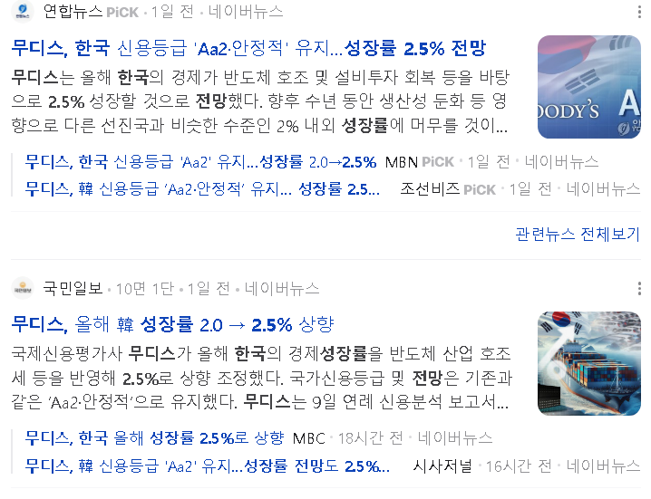 ☞ 국제신용평가사 무디스, 9일 한국의 국가신용등급 기존과 같은 ‘Aa2’ Aa2, 세번째로 높은 등급. 등급 전망도 ‘안정적’을 부여 고령화, 생산성 둔화, 대북 리스크 등은 하방 요인으로 꼽혀 무디스, 한국의 국가채무가 다른 선진국 대비 유사하거나 낮은 수준을 유지하고 있으며, 향후 경기 대응을 위한 재정적 역 량도 유지하고 있다고 평가 올해 한국의 경제가 반도체 호조 및 설비투자 회복 등으로 2.5% 성장할 것으로 전망