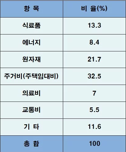 물가가 올랐다는 것을 측정하기 위해서는 기준물이 필요합니다. 비교할 대상이 있어야만 물가 상승 정도를 측정할 수 있으므로 그런 기준물을 담아 놓은 것을 바스켓이라고 합니다. 바스켓에는 국민들의 모든 구매 패턴을 대변할 수 있는 상품은 물론 서비스까지도 모두 담아둡니다. 상당히 큰 샘플(보통 8만 개 이상)을 통해 바스켓을 측정하고 각 요인마다 비중을 정합니다.