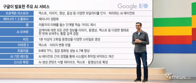 '프로젝트 아스트라'로 불리는 생성형 AI 비서 기능도 발표했다. 인간처럼 보고 듣고 배우는 미래형 AI 에이전트다. 텍스트, 이미지, 영상, 음성 등 다양한 정보를 이해하고 처리하는 멀티모달 기술이 탑재됐다. 모바일 기기나 스마트 안경을 통해 언제 어디서든 전문적인 도움을 제공할 계획이다.