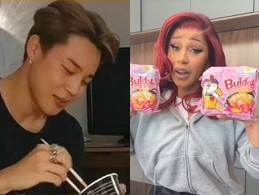 (Jimin, a BTS member, unintentionally served as an ambassador while eating spicy chicken noodles on a live broadcast. Recently, famous rapper Cardi B drew attention by saying in a video posted on his SNS account, "I drove for 30 minutes to buy this product.")