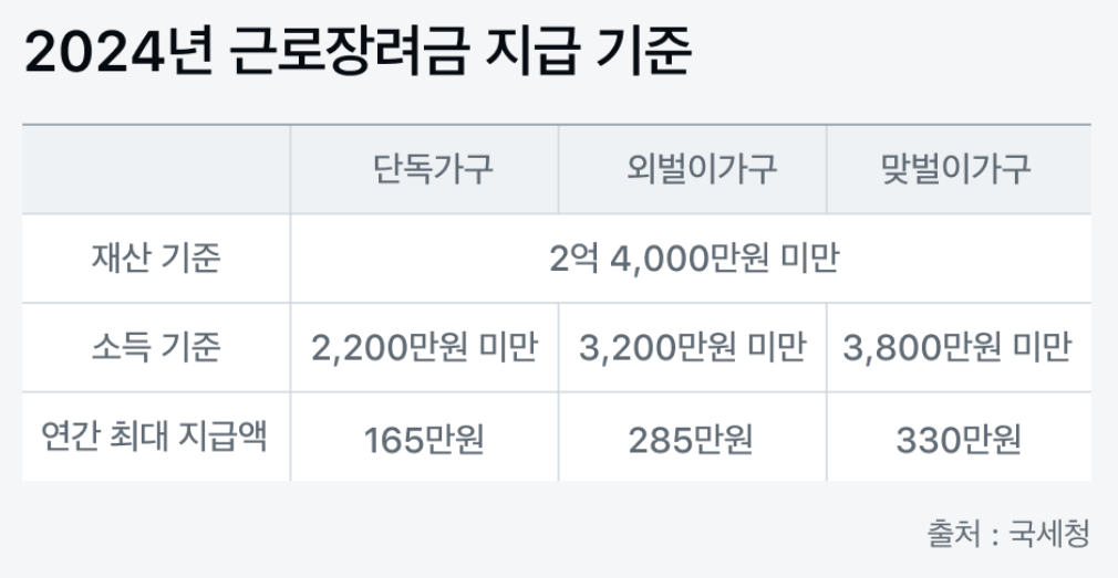 : 총소득금액은 기준금액 미만이어야 합니다. 총급여액 등에 의하여 장려금을 산정하여 각 해당가구에게 맞게 지급합니다.