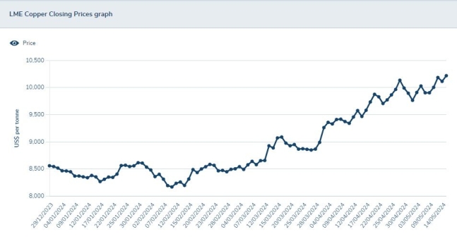 구리에 대한 관심이 정말 뜨겁습니다. 구리 가격은 이미 올해 들어 19.4%나 뛰었습니다. 15일 런던금속거래소(LME)에서 구리 선물 종가는 1만219달러로, 역사상 최고점(2021년 5월 1만460달러)에 근접했죠.