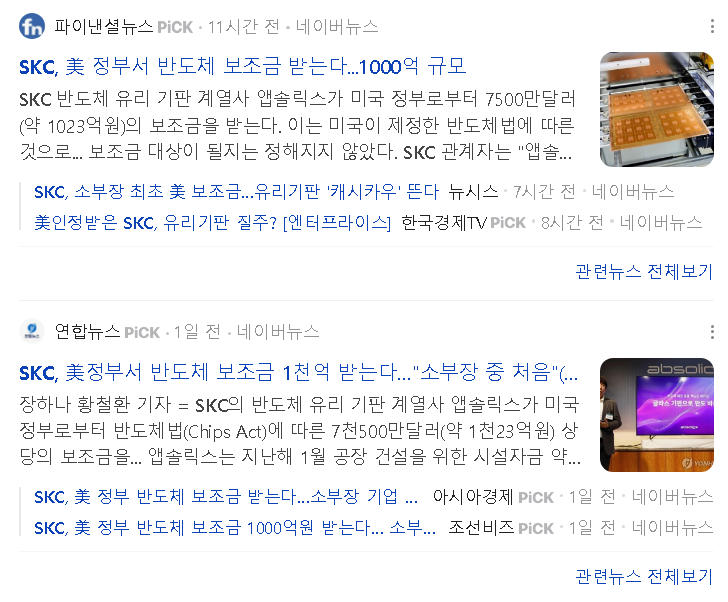 | SKC | 미국 정부 반도체 보조금 지원 소식에 강세, +0.09% 상승한 117,100원으로 마감 |
