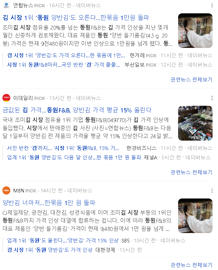 ▶ 음식 관련주는 "김" 관련하여 가격이 10,000원 이상으로 올라갈 것으로 보여지고 있고 이에 김밥 및 냉동김밥 가격상승 등 영향으로 음식주가 강세를 보였습니다.
