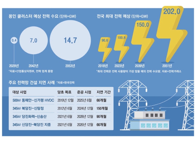 용인 일대에 삼성전자와 SK하이닉스가 622조원을 투입해 조성하는 '메가 반도체 클러스터' 전력 수요량이 대형 원전 14대 이상 발전량에 맞먹을 정도로 막대할 전망이다. 클러스터가 필요로 하는 전력 대부분은 지방에서 송전망을 통해 끌어와야 하는데, 그동안 전력망 구축은 주민 반대와 부처 간 이견으로 길게는 10년 넘게 미뤄지기 일쑤였다.