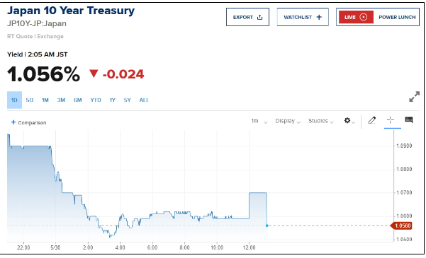(1) 미국뿐 아니라 일본에서도 10년물 수익률이 13년 만에 19%를 넘는 등 금리가 여전 상승하고 있었는데, 반세 일본 국채 10년물 수익률은 1.05%대로 내려왔습니다. 결과가 괄목할만합니다. 아프레는 금리가 올라감에 따라 더 낮아졌습니다. 결과가 1.1%로 치솟기도 했던 일본 국채 10년물 수익률은 다시 1.05%대로 내려왔습니다.