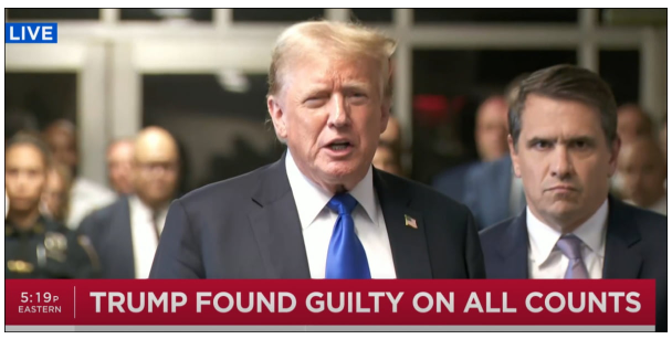 오늘 장마감 후 도널드 트럼프 전 대통령은 뉴욕에서 열린 형사재판에서 유죄 판결을 받았습니다. 배심원들은 2016년 대선 직전 로고 베냉 스토어에 대한 비용을 은폐하기 위해 돈을 송금한 사실을 은폐하기 위해 사업 기록을 위조한 혐의에 대해 34건 모두에 대해 유죄를 인정했습니다. 트럼프는 평생이 나온 두 "친구" 판결은 11월 대선에서 나를 겨냥한 것이다. 재판은 정치적 조작이고 마녀사냥이라고 방했습니다.