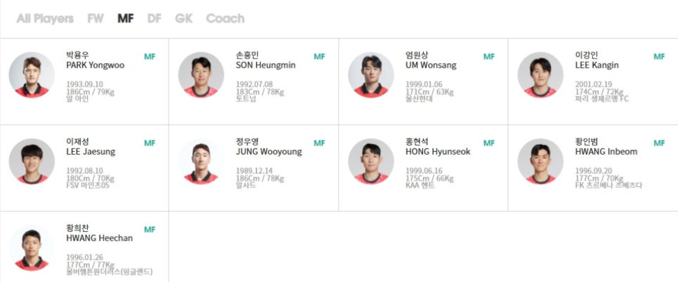 박용우 / 손흥민 / 엄원상 / 이강인 / 이재성 / 정우영 / 홍현석 / 황인범 / 황희찬