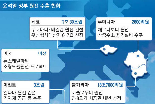 윤석열 정부가 탈원전 완전 폐기 선언과 함께 추가 원전 건설 계획을 밝히면서 해외 원전 수출에도 청신호카 켜졌다. 특히 이르면 이달 30조원 규모의 체코 원전 수주 결과가 나올 전망이어서 한국의 수주전에도 힘이 실릴 것으로 전망된다. 정부는 2030년까지 원전 10기 수출 목표를 세웠다.