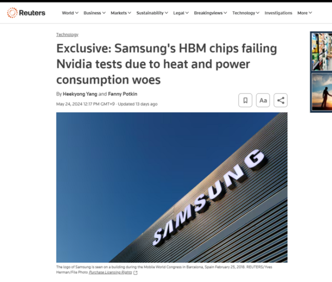 삼성전자는 로이터 보도가 나왔을 당시 “다양한 글로벌 파트너들과 HBM 공급을 위한 테스트를 순조롭게 진행하고 있다”고 반박한 바 있습니다. 해당 기사에 대해 황 CEO는 “(발열) 같은 이유로 실패한 것이 아니고, 그런 보도는 아무것도 아니다”며 “삼성과의 작업은 잘 진행되고 있다”고 삼성의 손을 들어줬습니다.