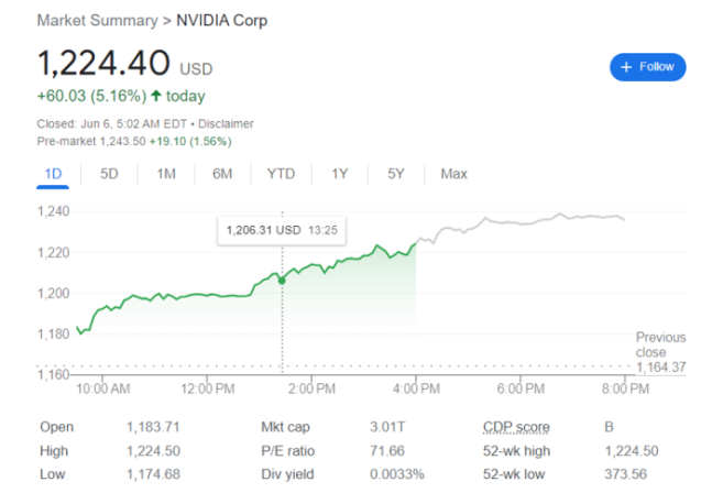 엔비디아는 시가총액 3조 달러에 진입하며, 시총 2위 자리에 올랐습니다. 5일(현지시간) 뉴욕 증시에서 엔비디아 주가는 전날보다 5.16% 급등한 1224.40달러(약 168만원)에 거래를 마쳤습니다.