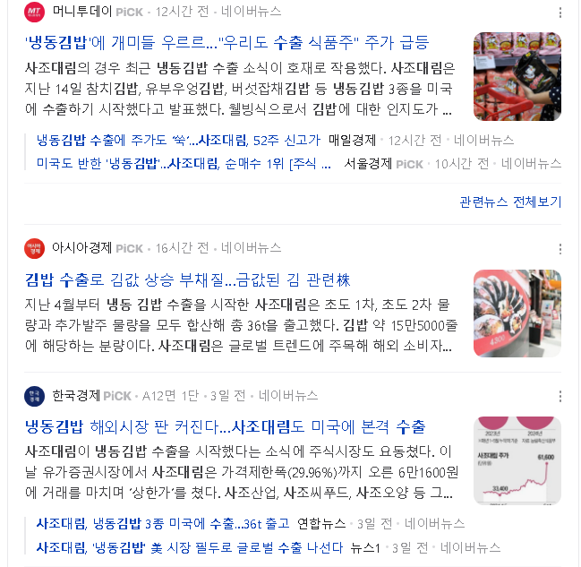 ☞ 냉동김밥의 미국 수출을 비롯한 K-푸드 수출 기대감이 투자심리 확대 웰빙식으로서 김밥에 대한 인지도가 높아진 미국 시장 공략을 본격화하는 것으로 풀이 사조대림, 삼양식품, 사조대림, 롯데칠성과 빙그레 등등 수출 이슈가 부각된 종목 강세 흐름 지속