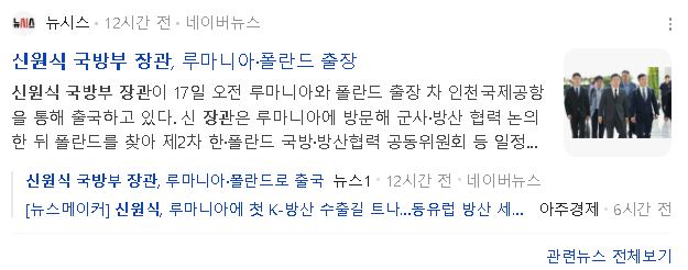 ☞ 17일 국방부에 따르면 신원식 국방부 장관은 이날부터 19일까지 루마니아와 폴란드를 공식방문 올해 방산수출 목표인 200억 달러(약 26조7200억원) 달성에 루마니아가 발판을 마련해줄지 주목 루마니아가 국내 무기체계를 수입한다면 K-방산이 처음 도입한 사례 올해로 나토 가입 20주년을 맞은 루마니아는 국방예산을 국내총생산 대비 현재 2% 수준에서 2.5%까지 확대 2032년까지 주요 무기 도입에 399억 달러(약 54조 원)를 투입하며 지역 안보에 적극 대응한다는 계획