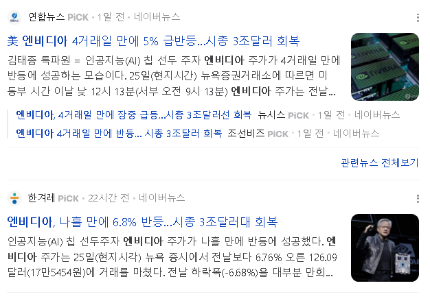 ☞ 엔비디아, 주가 4거래일 만에 반등 - 엔비디아 급락 이후 AI 거품 우려 확대 월스트리트 애널리스트의 약 90% 여전히 엔비디아에 대한 주식 매수 의견 유지로 낙관론 우위 "엔비디아의 조정 AI에 대한 구조적 투자나 광범위한 주식 전망에 대한 경고 신호로 오해해서는 안된다"말해