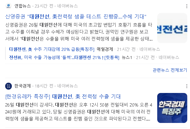 - 대원전선 수출 위해 미국 여러 전력청에서 샘플 제공상태로 테스트 진행 중