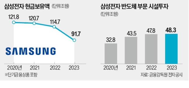 삼성전자가 외부 자금 조달 여부를 들여다본 것은 돈이 모자라서가 아니다. 삼성전자는 91조원의 현금 및 현금성 자산(작년 말 기준)을 보유하고 있다. 싼 금리의 자금을 일부 조달해 자금 운용의 효율성을 높일 수 있다고 봐서다. 삼성전자 관계자는 “대출 한도와 금리 수준을 알아본 것은 맞지만 신청 여부는 아직 확정된 바 없다”고 말했다.