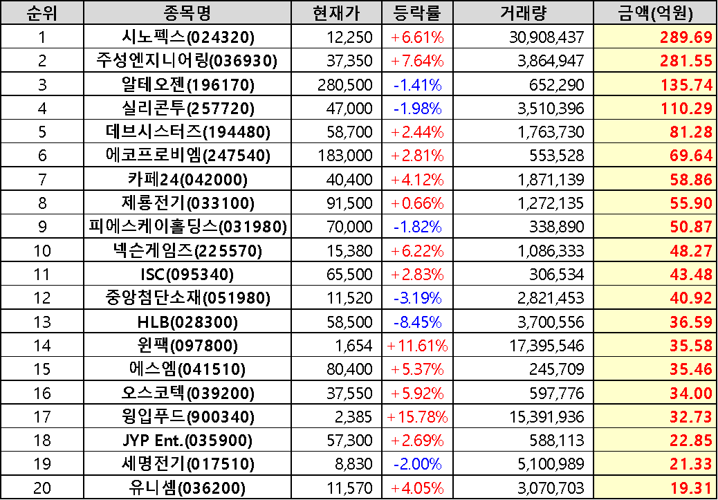 코스닥 외국인 순매수 상위종목(금액기준) Top20