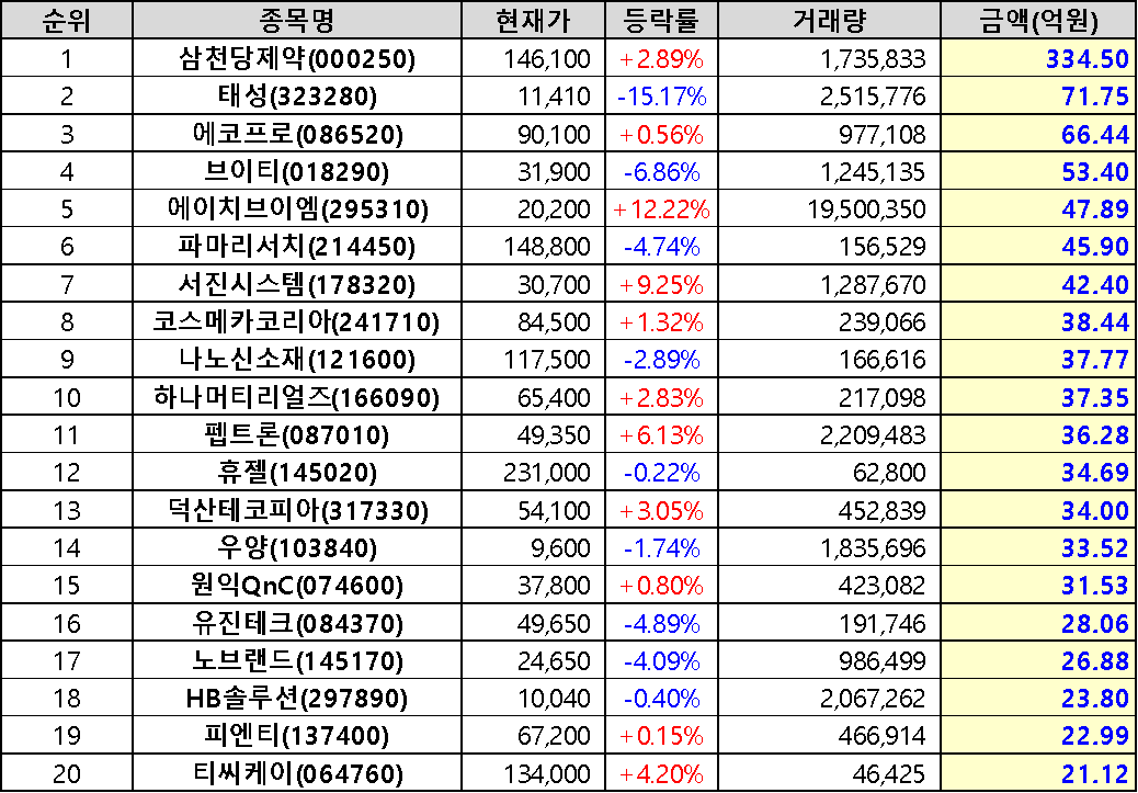 코스닥 외국인 순매수 상위종목(금액기준) Top20