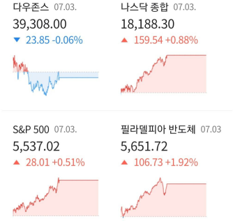 7월 3일(수) 저녁에 있었던 미국증시에 대해 간단히 정리하여 브리핑 진행하겠습니다.