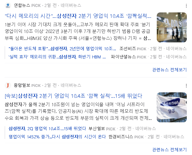 ☞ 올해 2분기10조원 넘는 영업이익으로 어닝 서프라이즈 행진 AI 시장 확대에 따른 메모리 반도체 수요 회복과 가격 상승등으로 반도체 부문 실적 크게 개선