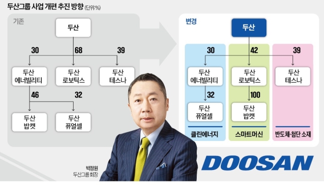두산그룹은 사업 재편 작업이 끝나면 ‘클린에너지’와 ‘스마트머신’ ‘첨단소재’ 등 3대 축으로 바뀐다고 밝혔다. 에너지 사업은 두산에너빌리티와 두산퓨얼셀이 맡는다. 두산에너빌리티 자회사인 두산밥캣은 두산로보틱스로 넘어가 제조 분야에서 시너지를 낸다. 반도체 및 첨단소재 부문은 두산테스나가 중심이다.