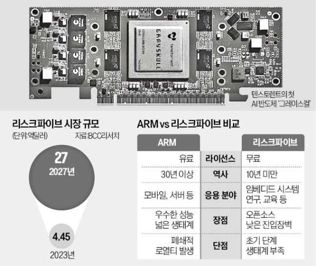 개방형 아키텍처(설계 언어) 리스크파이브를 활용하는 팹리스(반도체 설계 전문회사)에 관심이 커지고 있다. 저전력 인공지능(AI) 반도체가 미래 산업의 ‘게임 체인저’로 부상하면서 생긴 일이다. 주요 제조 대기업과 빅테크는 이 분야 선두인 텐스토렌트와의 협력을 강화하는 등 우군 확보에 열을 올리고 있다.